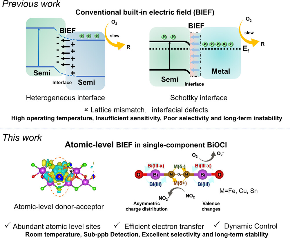 Chemiresistor sensors are essential for real-time environmental monitoring, yet conventional devices suffer from persistent limitations: high operating temperatures, insufficient sensitivity, poor selectivity, and long-term instability. To overcome these challenges, an atomic-level built-in electric field (BIEF) strategy is proposed through Fe-doped BiOCl (Fe-BOC), which drives directional electron migration within a single-component material with hierarchical nanoflower structures. This atomic-level BIEF, generated by asymmetric Fe─O─Bi sites, synergizes with dynamic Fe2+/Fe3+ valence transitions to construct an “electric field engine”. This engine promotes cyclic electron flow and enhances oxygen activation, achieving ultra-sensitive NO2 detection at 117 ppt with a rapid response time (<10 and="" outstanding="" stability="">6 months) at room temperature. The universality of this design is demonstrated by extending it to Cu and Sn dopants, providing a scalable platform for next-generation gas sensors. A wireless sensing system further validates its real-world applicability.