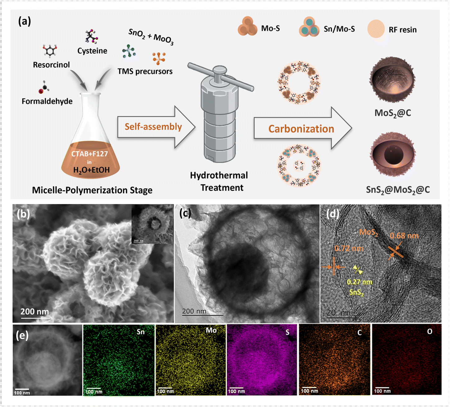 Lithium–sulfur (Li–S) batteries are promising candidates for future energy storage systems because of their abundant theoretical capacity and low cost. However, challenges such as polysulfide shuttle effects and poor conductivity hinder their practical use. Yolk–shell structured nanocomposites offer a promising avenue for addressing the challenges in Li–S batteries. Herein, one-pot hydrothermal synthesis of yolk–shell SnS2@MoS2@C nanospheres is reported, where the inclusion of the tin precursor plays a pivotal role in tuning these unique nanostructures. The resulting architecture provides enlarged interlayer spacing, internal voids, and robust stability, facilitating efficient ion transport and volume buffering. Electrochemical evaluations reveal a high initial capacity of 1445 mA h g−1 at 0.1C, with excellent rate-performance, retaining 802 mA h g−1 at 3C. Remarkably, at 1C, the capacity increases from 1044.8 to 1114.6 mA h g−1 after 600 cycles. These results highlight the structural and functional advantages of SnS2-driven yolk–shell architectures for next-generation Li–S cathodes.