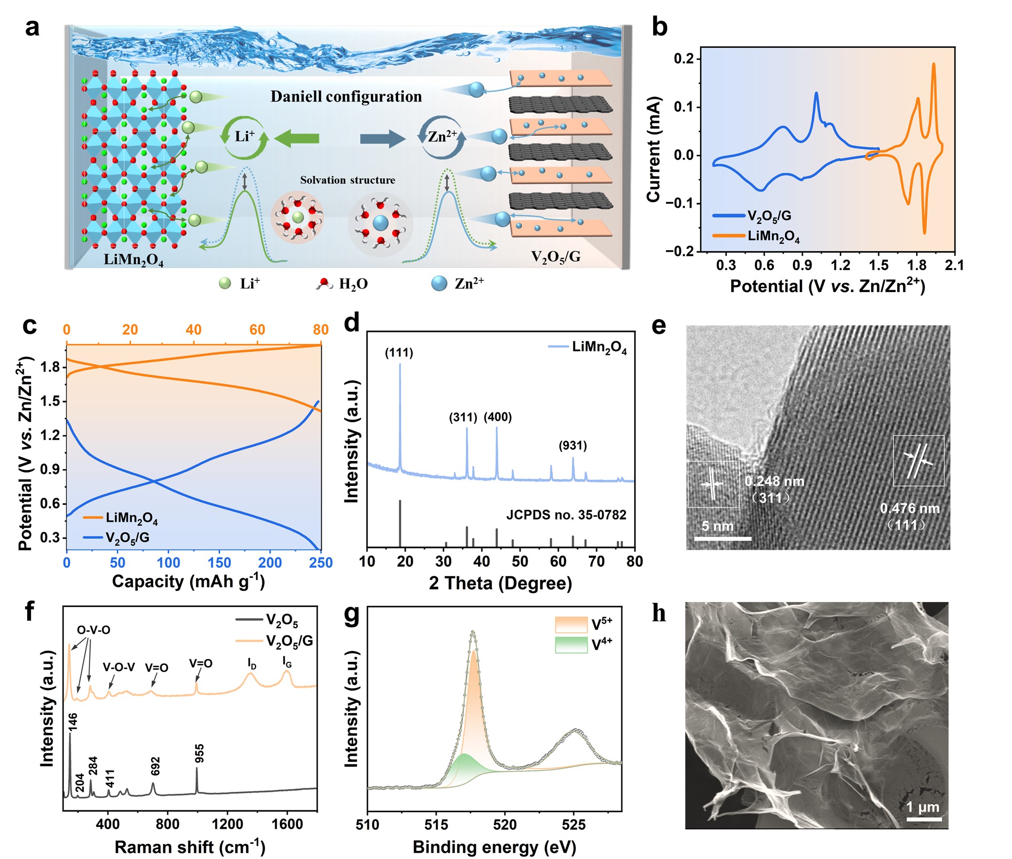 Battery-supercapacitor hybrid devices (BSHDs) possess great potential for applications owing to their high energy and power density, but the single charge carrier migration mechanism and limited electrode selection constrain their performance improvement. Herein, we report a novel Daniell-configuration dual-ion BSHD (V2O5/G|ZnSO4+Li2SO4|LiMn2O4) employing a pseudocapacitive zinc storage material of amorphous V2O5/graphene (V2O5/G) as anode and a battery-type lithium storage material of LiMn2O4 as cathode, with a mixed aqueous electrolyte of ZnSO4 and Li2SO4. The resulting device achieves a splendid specific capacity of 86 mAh g-1, high energy density of 82 Wh kg-1 and a power density of 3.9 kW kg-1, significantly outperforming most aqueous BSHDs based on single-ion electrolytes. Furthermore, it is revealed experimentally and theoretically that the self-orientating ion selection occurs in Daniell-type principle of Li+ insertion/extraction in LiMn2O4 cathode and Zn2+ insertion/extraction in V2O5/G, respectively. This work demonstrates an innovative device configuration with Zn2+ and Li+ as dual-cation charge carriers with self-orientation in different electrodes, deepening current understanding on the development of high performance electrochemical energy storage devices.