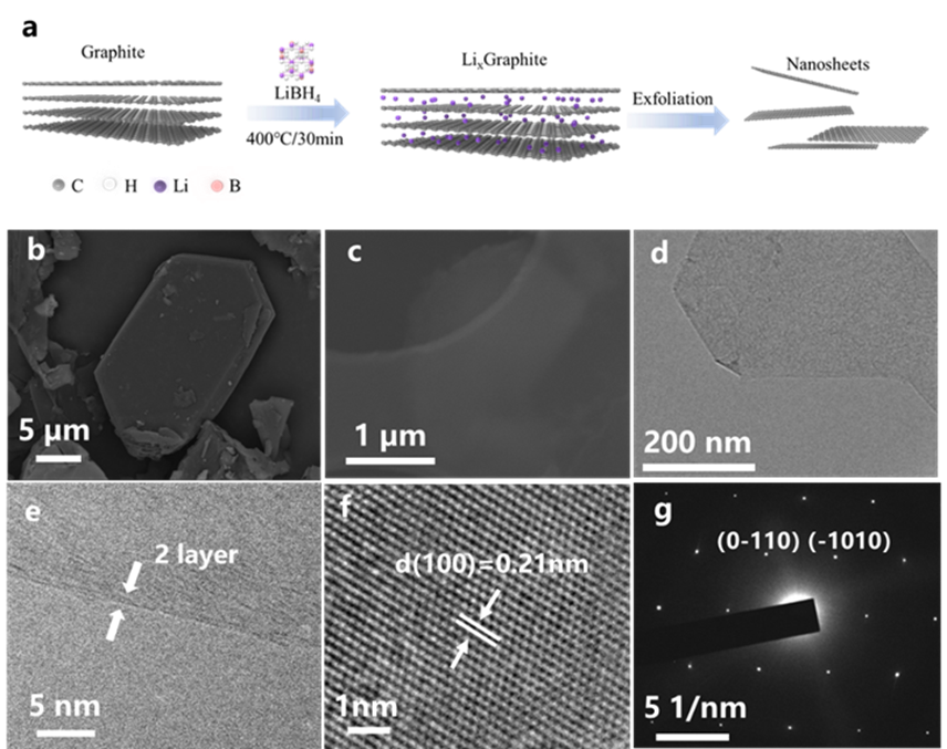 High-quality graphene prepared by eco-friendly green methods is critical to maximizing the performance of its applications. Here, we use solid lithiation and exfoliation to achieve the green and scalable production of high-quality graphene, avoiding the use of strongoxidants. This intercalation-exfoliation process yields high-quality few-layered graphene nanosheets with an average thickness of 1.1 nm and high crystallinity. The produced graphene nanosheets have a low defect density (ID/IG≈0.11) and a high C/O ratio (~24.6), enabling large-scale dispersed production with a yield of 26.7%. Further, our graphene nanosheets show good thermal stability, remaining stable without signifcant weight loss up to 550 °C and almost completely decomposing around 700 °C during thermogravimetric analysis. In addition, the as-exfoliated graphene nanosheets were used as an conductive substrate for oxygen evolution reaction catalyst. Co-loaded graphene exhibits excellent catalytic activity and long-term stability, with an overpotential of 0.34 V at 10 mA cm-2 and a Tafel slope of 99 mV dec−1. Therefore, our work provides an efficient method for the green production of high-quality graphene.