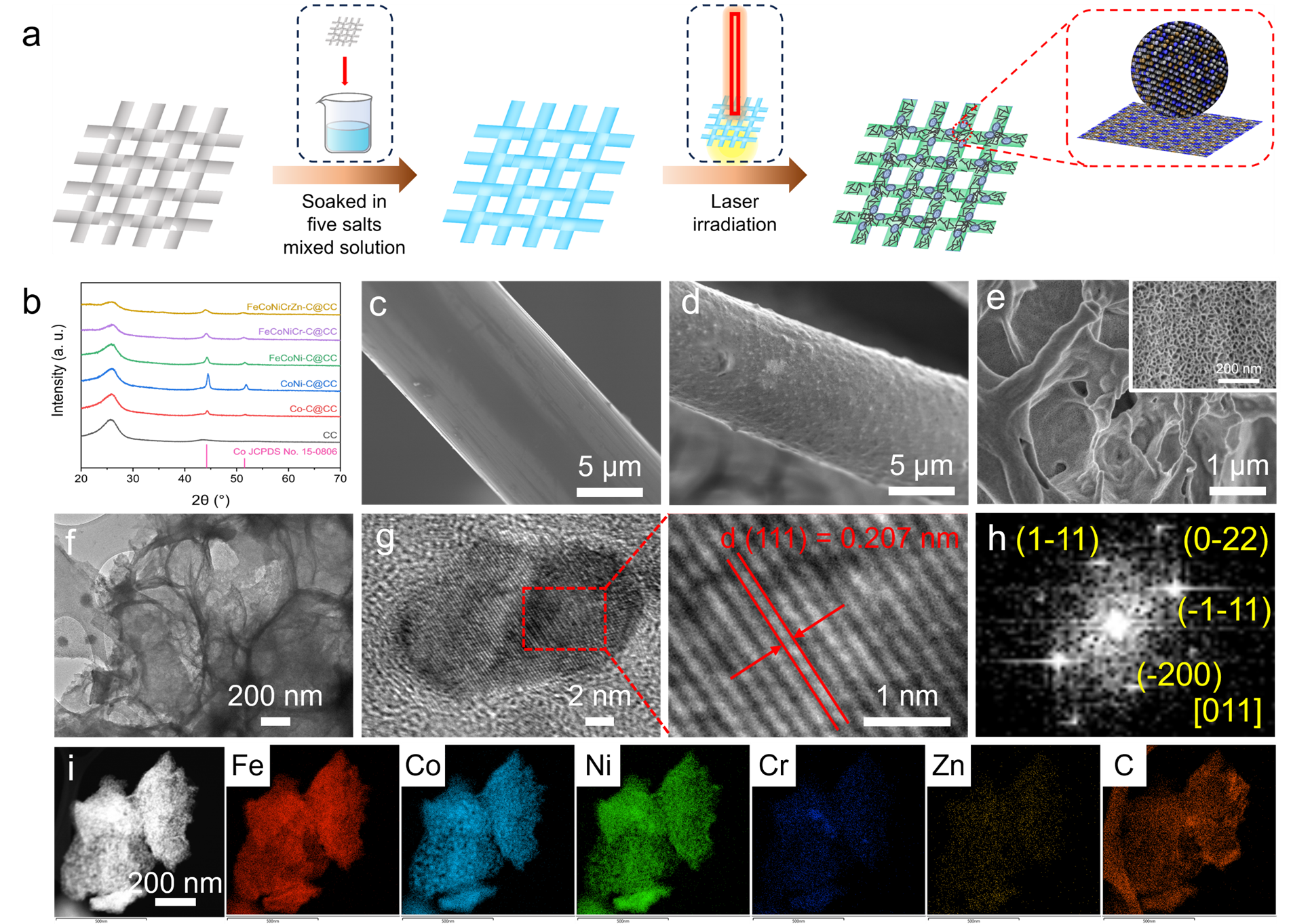 The large-scale implementation of electrocatalytic water splitting for green hydrogen production is hindered by the sluggish kinetics of the oxygen evolution reaction (OER), necessitating efficient and durable catalysts. Here, we report an innovative ultrafast synthesis strategy using pulsed laser irradiation for the one-step fabrication of a nanoporous carbon-coated FeCoNiCrZn high-entropy alloy (HEA) supported on carbon cloth (FeCoNiCrZn-C@CC), with L-ascorbic acid as an auxiliary agent. This resulting catalyst exhibits exceptional OER performance, achieving an overpotential of only 233 mV at mA cm-2 and remarkable stability for 94 h at 250 mA cm-2. We attributed this enhanced activity to a unique active site architecture, enabled by in-situ generation of MIII-OOH (M=Fe, Co, Ni) active species, partial Cr dissolution and thermal dezincification. In-situ differential electrochemical mass spectrometry combined with first-principles calculations reveal that the OER follows an adsorbate evolution mechanism. This work not only presents a scalable laser-processing route for constructing high-performance HEA catalysts but also offers atomic-level insights into their rational design.